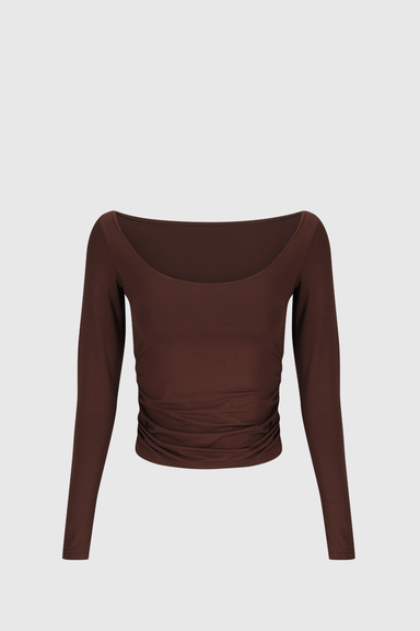 Dominique Healy Niveah Tee - Chocolate The Niveah Tee sits off the shoulder and features elasticated ruching down the front creating an elegant V n...
